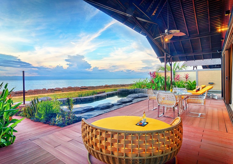Pool Villa: Diese ca. 171 qm große Villa bietet von ihrem privaten Pool (45qm) und einem offenen Balkon einen ungehinderten Blick auf das Meer. Ein privater Pavillon am Meer ist der perfekte Ort für ein romantisches Abendessen.