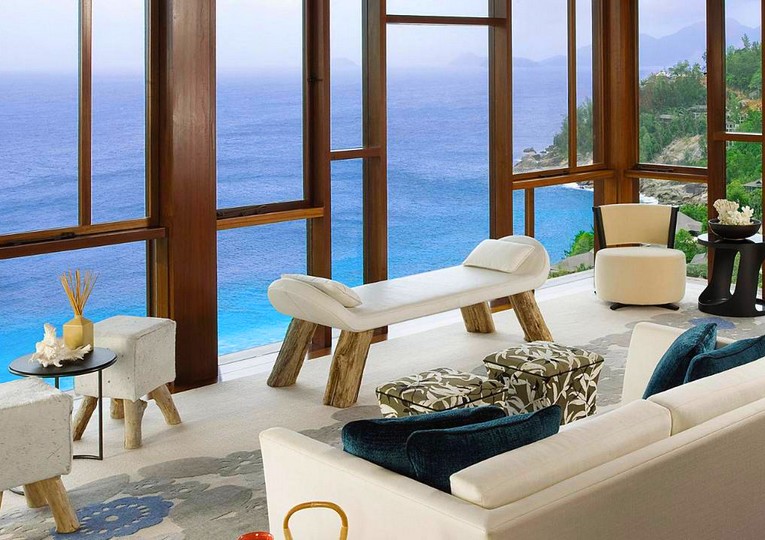 Hilltop Ocean View Villa (31): Höher auf dem Hügel gelegen mit durch die Vegetation teilweise eingeschränktem Panoramablick auf das Meer. Ocean View Suite (1) ca. 524 qm (ca. 211 qm Wohnbereich): Mit zwei Schlafzimmern/Badezimmern und herrlichem Panoramablick auf das Meer. Die Suite verfügt über ein besonderes Privatambiente, da sich ihre Räumlichkeiten auf 3 Pavillons verteilen und der Wohnbereich von den Schlafzimmern getrennt ist. Außenbereich mit weitläufiger Sonnenterrasse, Chaiselongues für 4 Personen und einem 78 qm großen Pool mit Whirlpool.