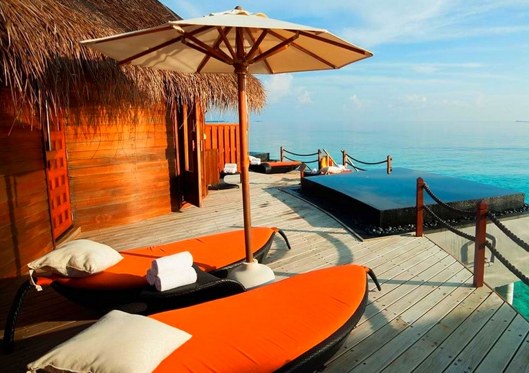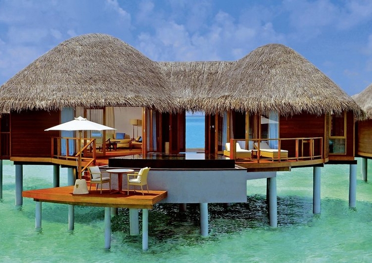 Water Villa (57) ca. 100 qm (ca. 64 qm Wohnfläche): Auf Stelzen in die Lagune gebaut, mit Sonnendeck und direktem Zugang zum Meer.